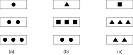 For example, in the figure below, (a) is a valid set, since all cards have the same figure type and all of them have a different number of figures. In the example (b), both the type of figures and the number of figures are different, making also a valid set. On the other hand, (c) is not a valid set, as the last two cards have the same figure, which is different from the figure in the first card.