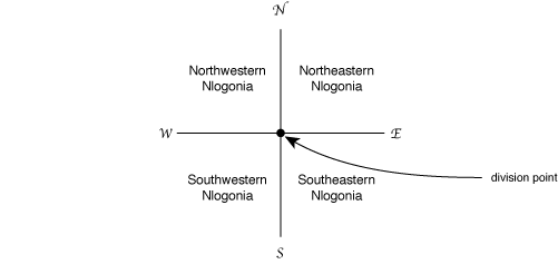 It was agreed that one point, called division point, with coordinates established in the negotiations, would define the country division, in the following way. Two lines, both containing the division point, one in the North-South direction and one in the East-West direction, would be drawn on the map, dividing the land into four new countries. Starting from the Western-most, Northern-most quadrant, in clockwise direction, the new countries will be called Northwestern Nlogonia, Northeastern Nlogonia, Southeastern Nlogonia and Southwestern Nlogonia.