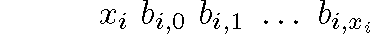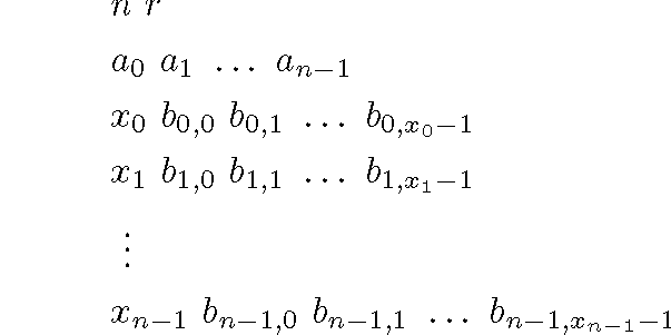 Each case begins with the integer n (1 ≤ n ≤ 50), which is the number of elements in the list of integers that Alice is given. The integer r (1 ≤ r ≤ 109) is the number of times these operations are to be repeated on a list before returning the result. The values are the nonnegative integers in the original list. Then n lines follow that define how Alice will generate a new list from a previous one. Each of these lines are in the form: