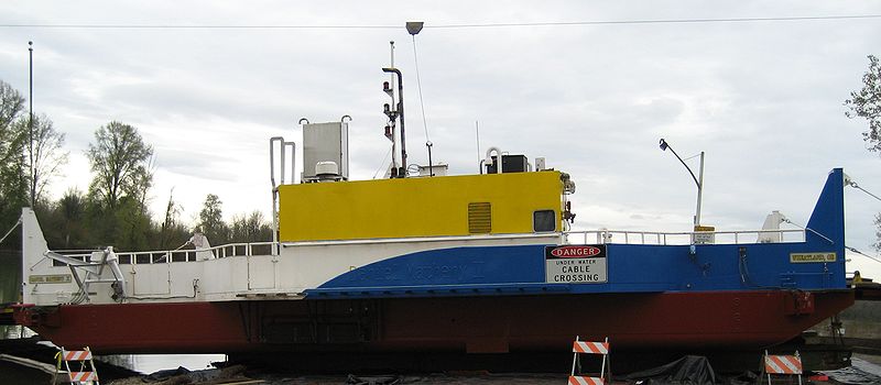 The vehicles waiting to board the ferry form a single queue, and the operator directs each vehicle in turn to drive onto the port (left) or starboard (right) lane of the ferry so as to balance the load. Each vehicle in the queue has a different weight, which the operator estimates by inspecting the queue.